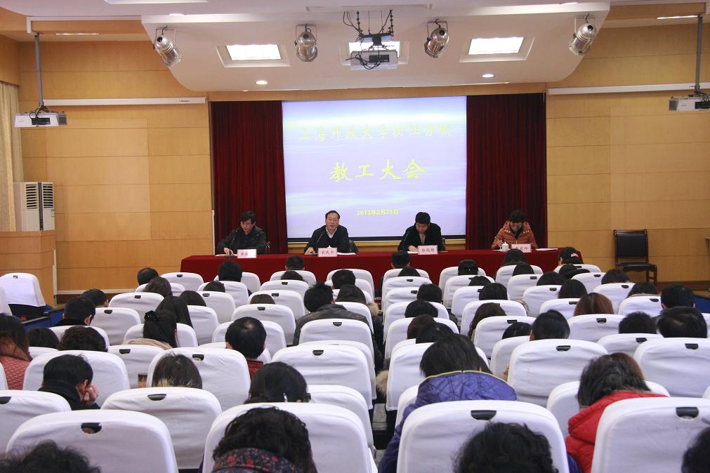宋庆平校长在会上充分肯定了上学期各项工作取得的成绩,并对新学期学校工作做了部署。他指出,在学校转型发展的新形势下,要坚持“以人为本,文化立校,走内涵发展道路”的办学方向,坚持以教育教学工作为中心,以教学质量为学校生命线的工作主线。面对转型后的新情况,宋校长重点阐述了 “巩固基础,深化内涵,提升品牌,转型发展”新十六字工作目标的重要内涵,并要求全体教职员工从以下四个方面贯彻“转型发展”:一是要起草松江开大的建设方案;二是要宣传、实践学分银行;三是教师要为学校的转型发展做好准备;四是要加强对开大的宣传。他强调,转型开大后,学校将成为构建区终身教育体系和学习型社会建设的重要平台,这也将是学校发展的重要里程碑。