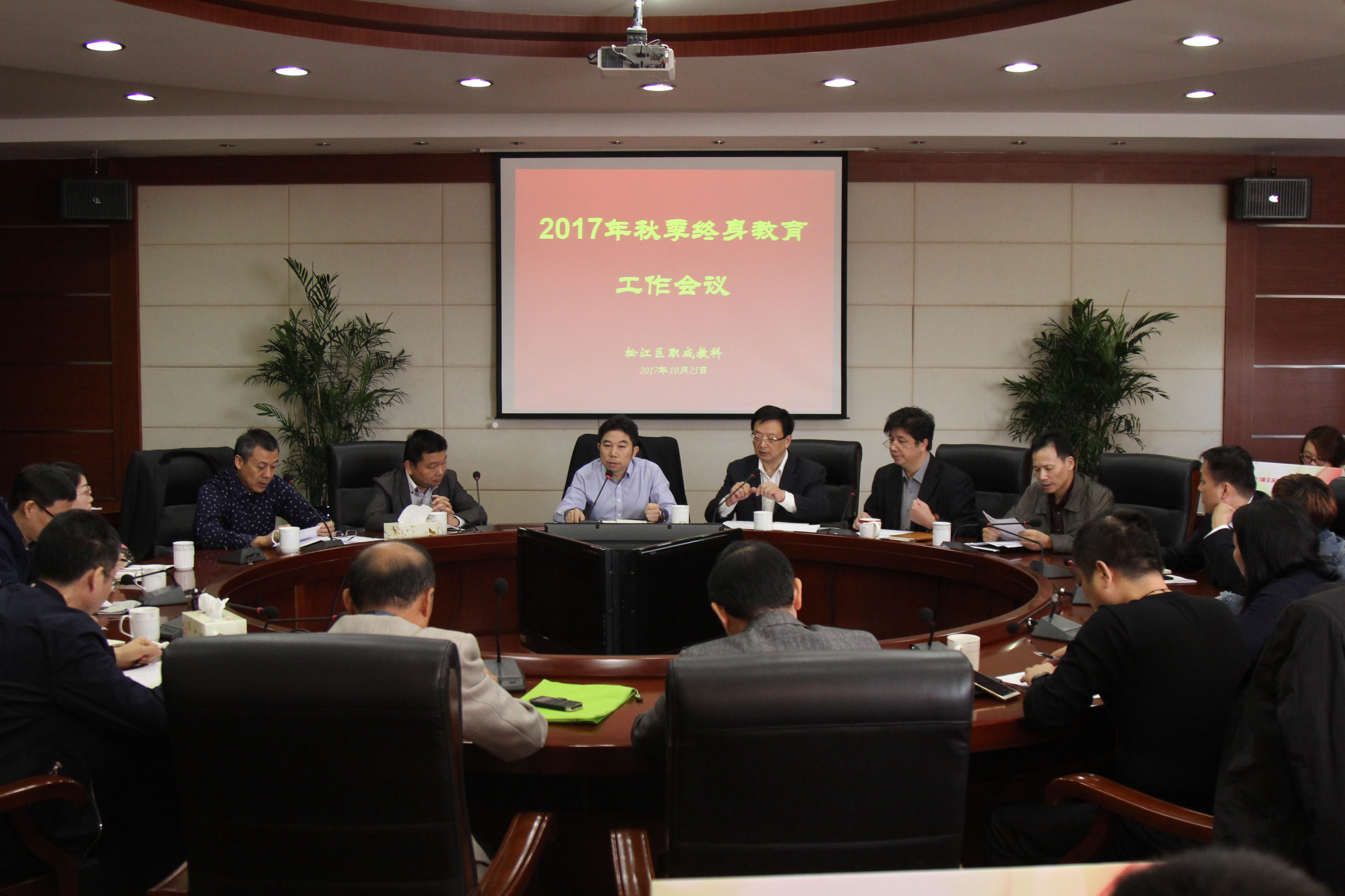 10月25日上午,2017年秋季终身教育工作会议于松江区社区学院305会议室召开,松江区教育局职成教科科长张峰、松江区教育局职成教科副科长方航、上海开放大学松江分校校长兼松江区社区学院院长周明、松江区社区学院副院长王正勇、社教部主任李桂明、各社区学校校长和事业办主任,以及相关工作人员出席会议。会议由张峰主持。