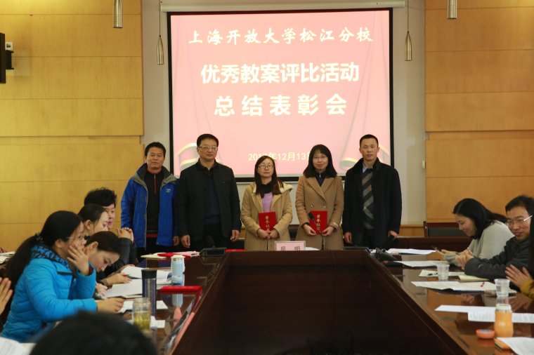 周明为获奖教师颁奖,师资处对此次优秀教案活动作了总结,获奖教师代表、评委教师代表进行了交流发言。