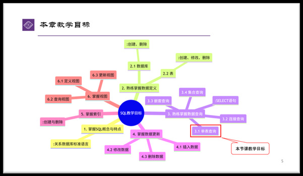 在课件制作过程中,我总结了几个小技巧:一是善用可视化工具,用思维导图展现课程知识点,用表格梳理SQL 语言组成、学生表数据等信息,用查询结果截图直观呈现语法效果,比纯文字更易让学生理解;二是突出核心重点,对 DISTINCT、WHERE、ORDER BY 等关键语法和关键字进行加粗标注,帮助学生快速抓取核心内容;三是循序渐进设计难度,从 “查询所有列” 的基础操作,到 “多条件组合查询”“排序查询” 的复杂应用,难度逐步提升,同时每个语法点都配套具体案例,避免 “只讲不练”;四是预留互动空间,课堂练习结合真实学生表数据,设计可实操的题目,让学生在练习中深化理解,增强参与感。