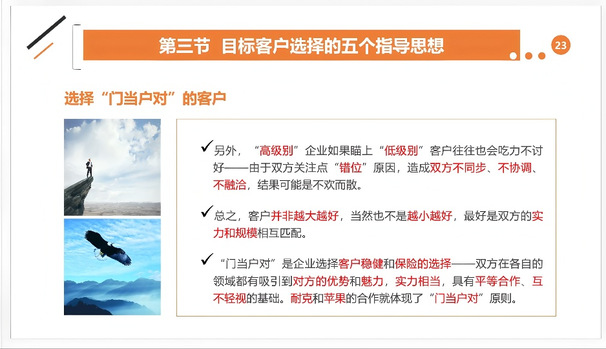 学员不需要知识的罗列,而是需要理解的路径。在设计《目标客户选择》这部分课件时,我将“客户匹配理论”等学术内核,翻译成“选择门当户对的客户”这一鲜明观点。通过“正反论证”(指出错配的恶果,明确匹配的优势)和“经典案例”(耐克与苹果)的嵌套,构建了一个从理论警示到实践参照的完整逻辑链,帮助学员快速搭建起属于自己的知识框架。